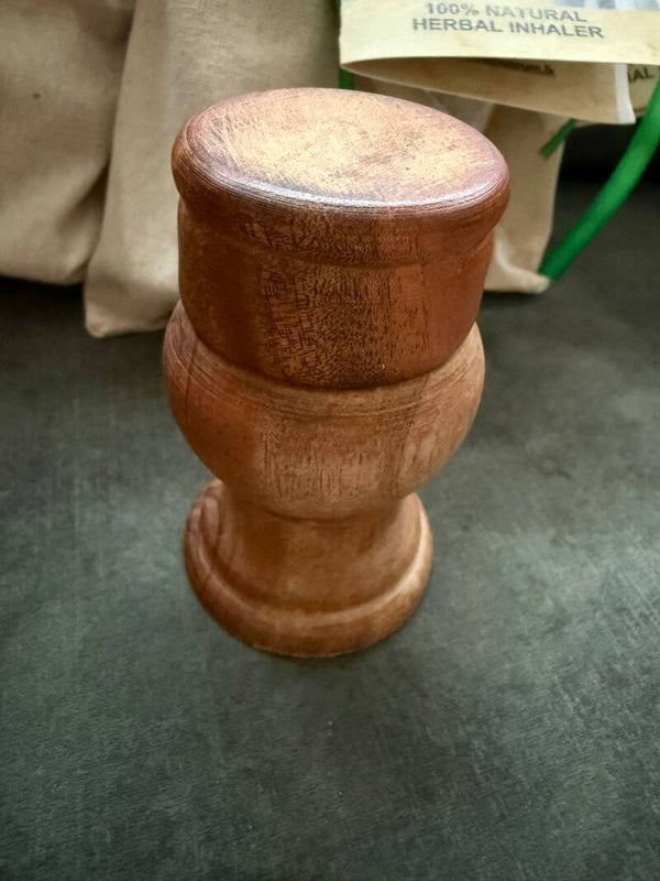 De inhaler is handgemaakt in Sri Lanka en zit in een mooie houten houder. Hij wordt geleverd in een natuurlijk katoenen zakje, waardoor hij makkelijk mee te nemen is en ideaal is voor gebruik thuis, onderweg of op het werk. Bij normaal gebruik gaat de inhaler ongeveer een jaar mee.